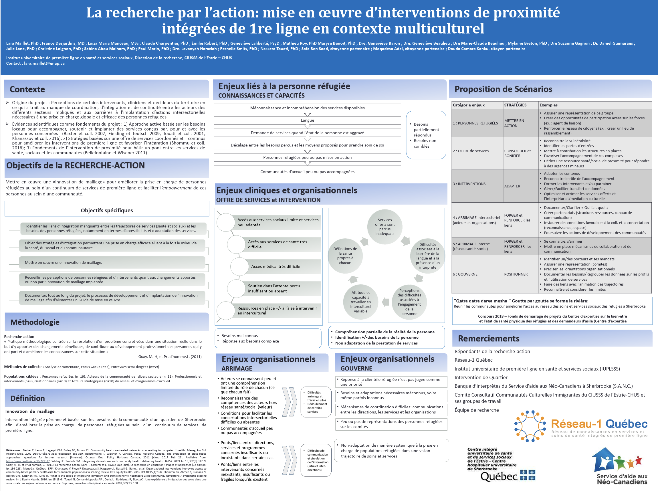 Objectif : Mettre en œuvre une « innovation de maillage », c'est-à-dire une intervention intégrée, pérenne et basée sur les besoins de la communauté d’un quartier de Sherbrooke afin d’améliorer la prise en charge de personnes réfugiées au sein d’un continuum de services de première ligne.