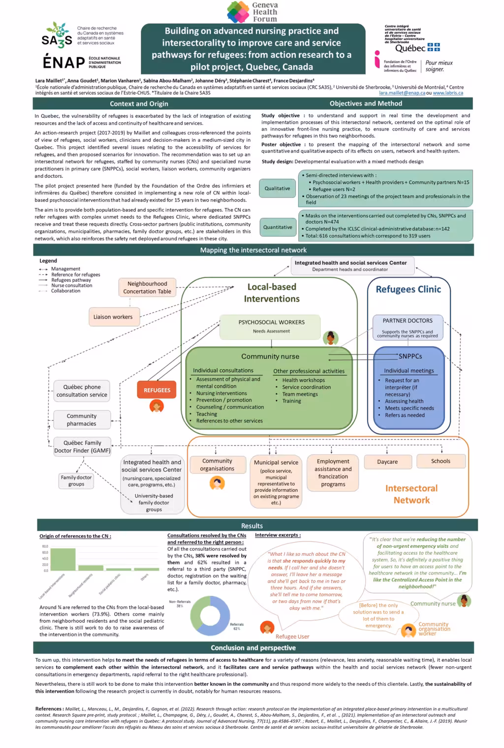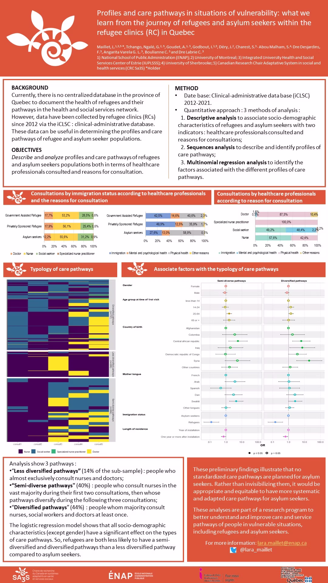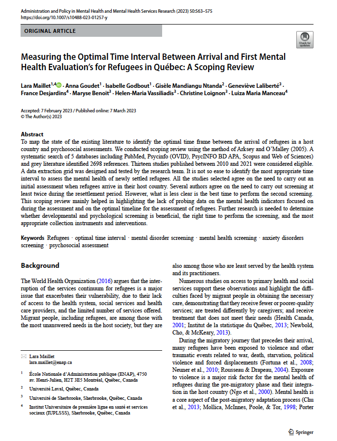 Équipe : Lara Maillet (ENAP, IUPLSSS), Helen-Maria Vasiliadis (UdeS), , Christine Loignon (UdeS), Dre France Desjardins (Clinique des Réfugiés, CIUSSS de l'Estrie-CHUS), Maryse Benoît (UdeS) Mélanie Gagnon (CERDA, CIUSSS Centre-Ouest-de-l’île-de-Montréal), Djamal Berbiche (Centre de recherche de l’Hôpital Charles-le-Moyne) et Geneviève Laliberté (étudiante UdeS)