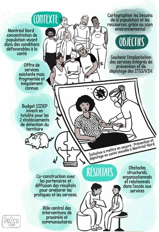 Le projet de recherche-action Se remettre de la pandémie : miser sur la proximité pour mettre en œuvre des interventions intégrées en santé sexuelle en contexte de vulnérabilité à Montréal est financé par Fonds de recherche du Québec – Action concertée. Programme de recherche sur les conséquences sociales de la pandémie (Projet #4, 2024-2025). Il s’agit d’un projet d’une durée de trois ans (2024-2027) qui consiste à évaluer et à accompagner le processus d’implantation des Services intégrés de dépistage et de prévention des infections transmissibles sexuellement et par le sang (SIDEP) dans un quartier défavorisé montréalais ayant été particulièrement affecté par la pandémie de la COVID-19. Ce projet vise également à mesurer les effets de l’utilisation des services sur les personnes qui utilisent le service, les organisations du réseau de la santé et des services sociaux ainsi que par les partenaires du territoire. D’abord, notre équipe réalisera un Scan environnemental pour documenter et cartographier les besoins à combler et les ressources du territoire (2024-2025). Ensuite, de concert avec l’ensemble des partenaires du projet, incluant des citoyen·es partenaires utilisateur·trices de services, nous développerons le modèle logique SIDEP, de même que des indicateurs de suivi et de performance multiniveaux des pratiques de proximité intersectorielles (2025-2026). Enfin, nous analyserons l’implantation des SIDEP et ses effets (2026-2027). Durant toute la durée du projet, des activités de transfert et de diffusion des connaissances sont prévues.