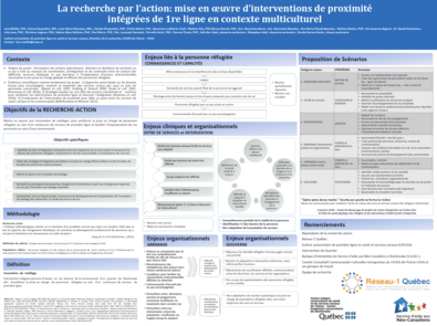 Lara Maillet (ÉNAP, IUPLSSS), Johanne Déry (UdeM), Stéphanie Charest (CIUSSSE-CHUS), Sabina Abou Malham (UdeS), Dre France Desjardins (Clinique des réfugiés, CIUSSSE-CHUS), Dre Christiane Labrie, MD (Clinique des réfugiés, CIUSSSE-CHUS), Julie Laflamme (CIUSSSE-CHUS), Carine Boulianne (CIUSSSE-CHUS), Grace Lynn Angarita Varela (CIUSSSE-CHUS), Nassera Touati, (ÉNAP), Arnaud Duhoux (UdeM), Chantal Doré (UdeS), Bernard Roy (ULaval), Suzanne Gagnon (Ulaval, CIUSSS Capitale-Nationale), Julie Lane (UdeS), Anna Goudet (ÉNAP), Geneviève Champagne (ÉNAP), Aurelle Jouego Fotso (ÉNAP).