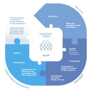 La trajectoire de soins et services est "une imbrication de plusieurs épisodes de soins et de services sur de longues périodes dans une perspective intersectorielle sur un territoire. Elle est centrée sur l'usager et regroupe des usagers ayant une condition clinique ou un profil similaire". Maillet, et al. 2021